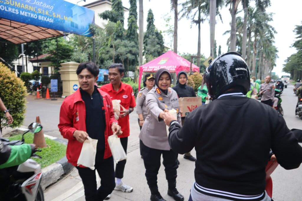 Bagi Takjil Dengan Ormas, Ojek Online, dan Mahasiswa: Polres Metro Bekasi Mengalirkan Kebaikan Ramadan