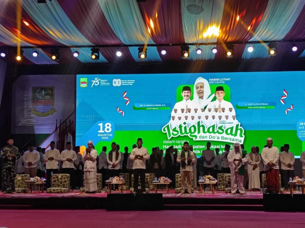 Penahitam.com // Kabupaten Bekasi – Dalam rangka memperingati Hari Jadi ke-75 Kabupaten Bekasi serta HUT ke-80 Kemerdekaan RI, Pemkab Bekasi menggelar istigosah dan doa bersama di Lapangan Plaza Komplek Perkantoran Pemda Kabupaten Bekasi, Desa Sukamahi, Kecamatan Cikarang Pusat, Senin (18/8/2025) malam.