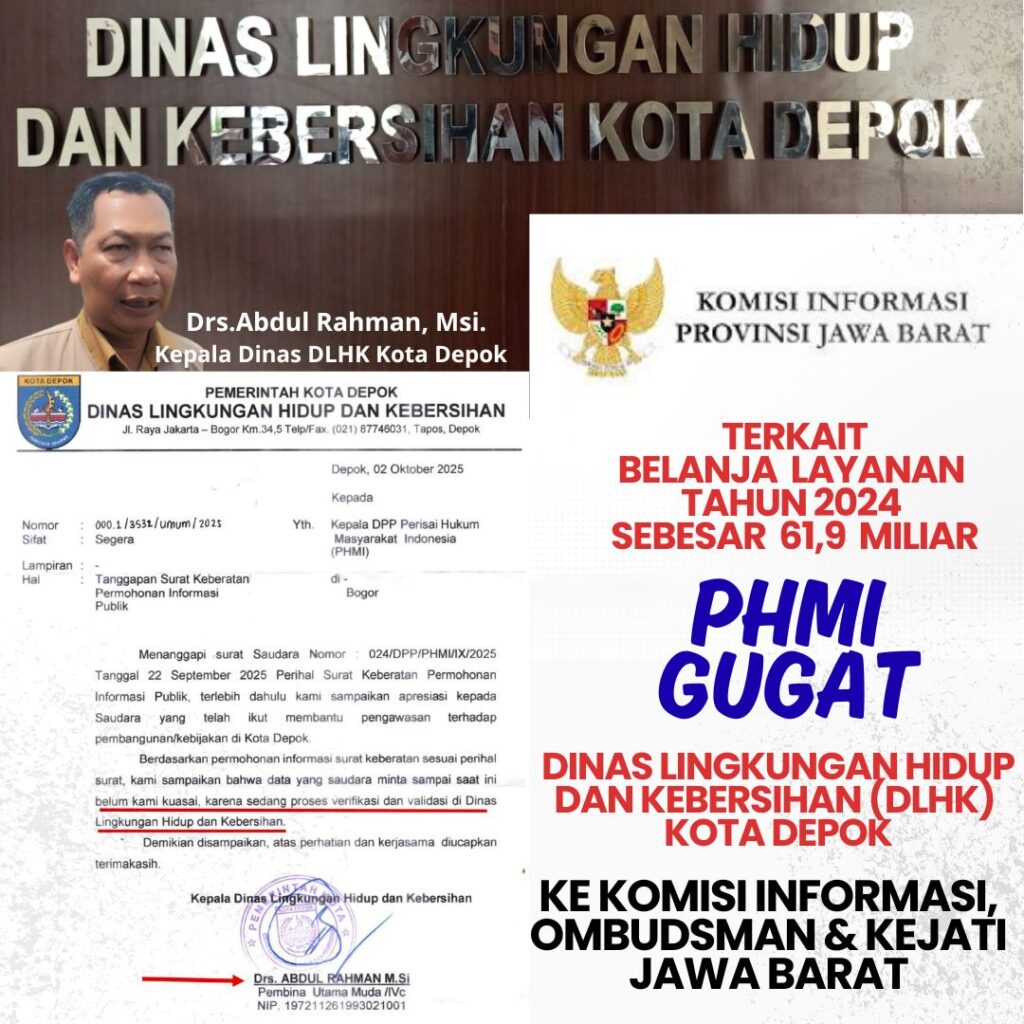Penahitam.com // Depok – Perisai Hukum Masyarakat Indonesia (PHMI) menggugat Dinas Lingkungan Hidup dan Kebersihan Kota Depok ke Komisi Informasi Jawa Barat, sebagaimana dituangkan dalam surat gugatan nomor 61/X/25 pada tanggal 17 Oktober 2025.