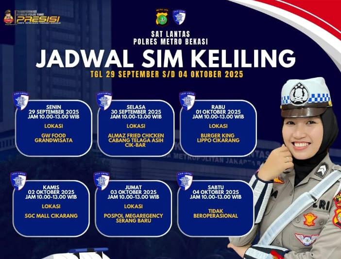 Jadwal SIM Keliling Polres Metro Bekasi 29 September – 04 Oktober 2025, Cek Lokasi dan Persyaratannya