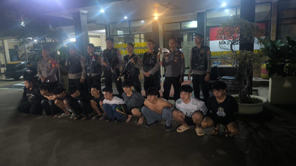 Total sepuluh remaja berhasil diamankan beserta sejumlah barang bukti, antara lain tiga bilah senjata tajam (celurit, corbek, dan sabit gagang putih), tiga butir obat jenis Tramadol golongan G, delapan unit handphone, serta tiga unit sepeda motor masing-masing Honda Vario dan dua Honda Beat dengan nomor polisi teridentifikasi.
