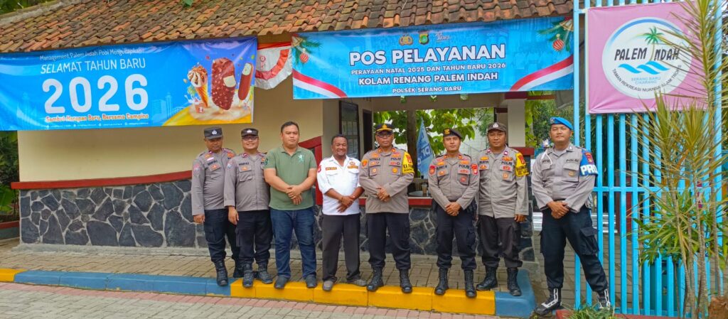 Penahitam.com // Kabupaten Bekasi – Kepolisian Resor Metro Bekasi melalui Polsek Serang Baru melaksanakan pengamanan Pos Pelayanan di kawasan wisata Kolam Renang Palem Indah, Desa Sukasari, Kecamatan Serang Baru, Kabupaten Bekasi, pada Sabtu (27/12/2025). Kegiatan ini dilakukan sebagai bagian dari upaya Polri dalam memberikan rasa aman dan nyaman kepada masyarakat selama libur Natal dan Tahun Baru.