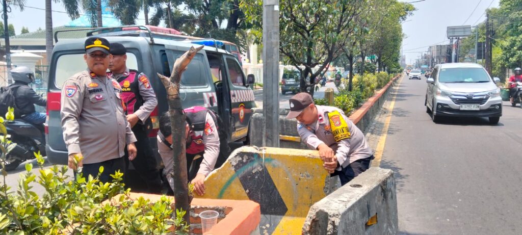 Kabupaten Bekasi — Personel Polsek Cikarang Utara melakukan patroli dan penertiban terhadap pembatas jalan yang dibuka secara ilegal oleh masyarakat di Jalan raya RE Martadinata, Kampung Teleng, Desa Karang Baru, Kamis (19/3/26).